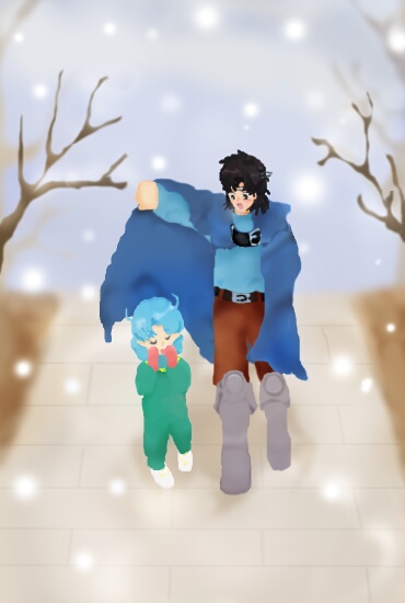 * 帰り道 * ルーミィ、風邪ひくぞ。 もう少しこっちにおいで。 ほら、雪がかからないだろう?