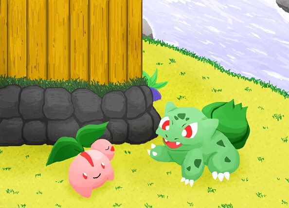 * 一緒に遊ぼう * 近所にフシギダネとチェリンボがいた。 これから、どこかに遊びに行くのだろうか…? 楽しそうな光景をスケッチしました。